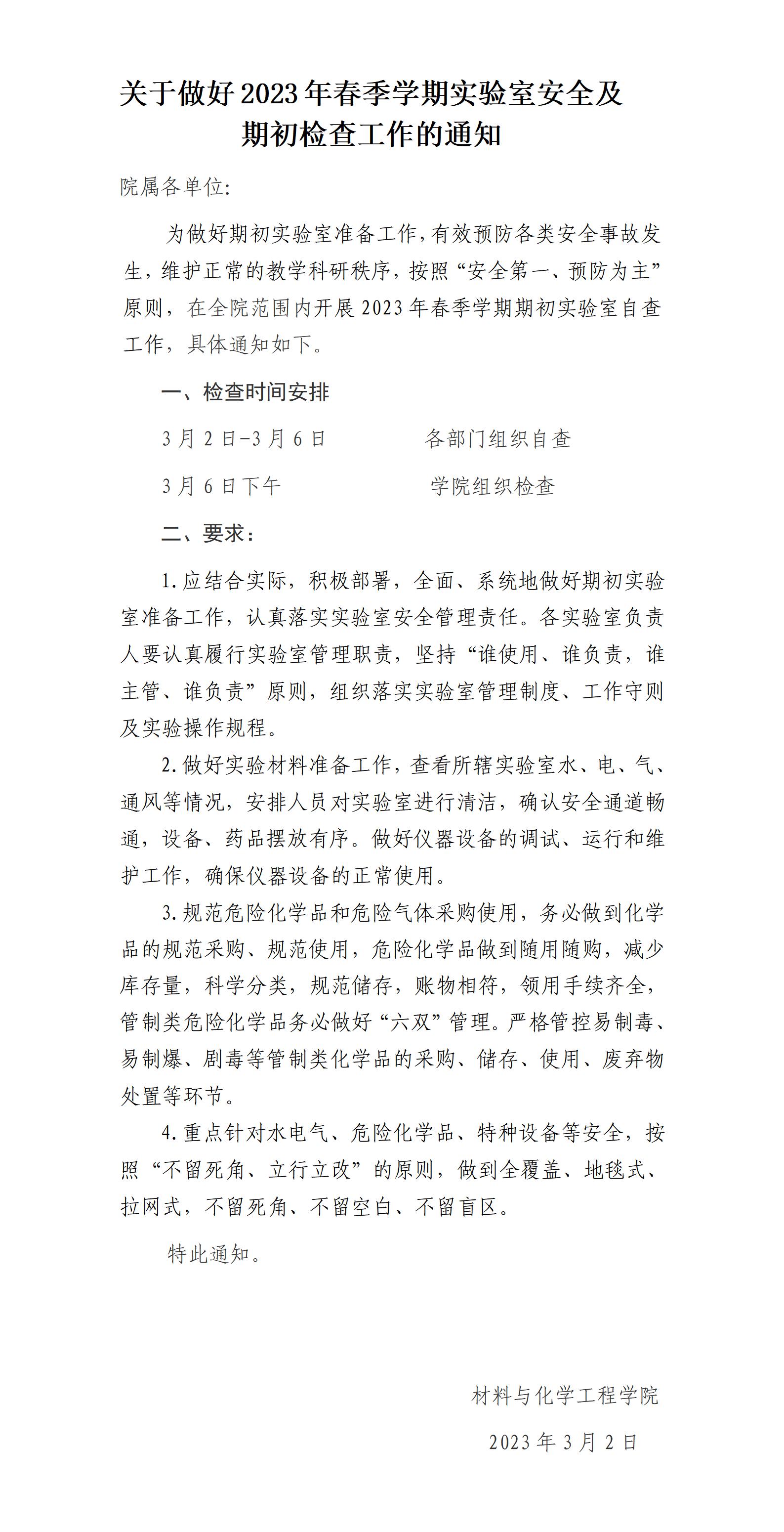 关于做好2023年春季学期实验室安全及期初检查工作的通知