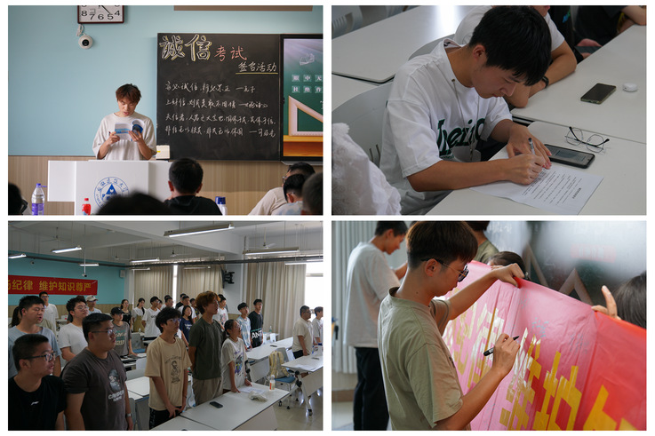 活动中,材化学院各班级共同学习了《安徽建筑大学学生手册》和《安徽建筑大学考试管理规定》等相关文件,通过解读“国考作弊入刑”、“校考作弊处分”相关条款、发出“诚信考试光荣,违纪作弊可耻”的倡议,引导同学们加强对诚信考试重要性的认识、树立诚实守信的行为习惯,鼓励同学们在各项考试中努力复习、认真备考,尽全力考出自己的真实水平。各班级以“签订一份诚信考试承诺书”、“组织一次诚信考试宣誓会”、“在诚信考试横幅签名”等形式为载体,进行广泛宣传,提高学生自觉维护考风考纪,养成遵守考试纪律的意识。