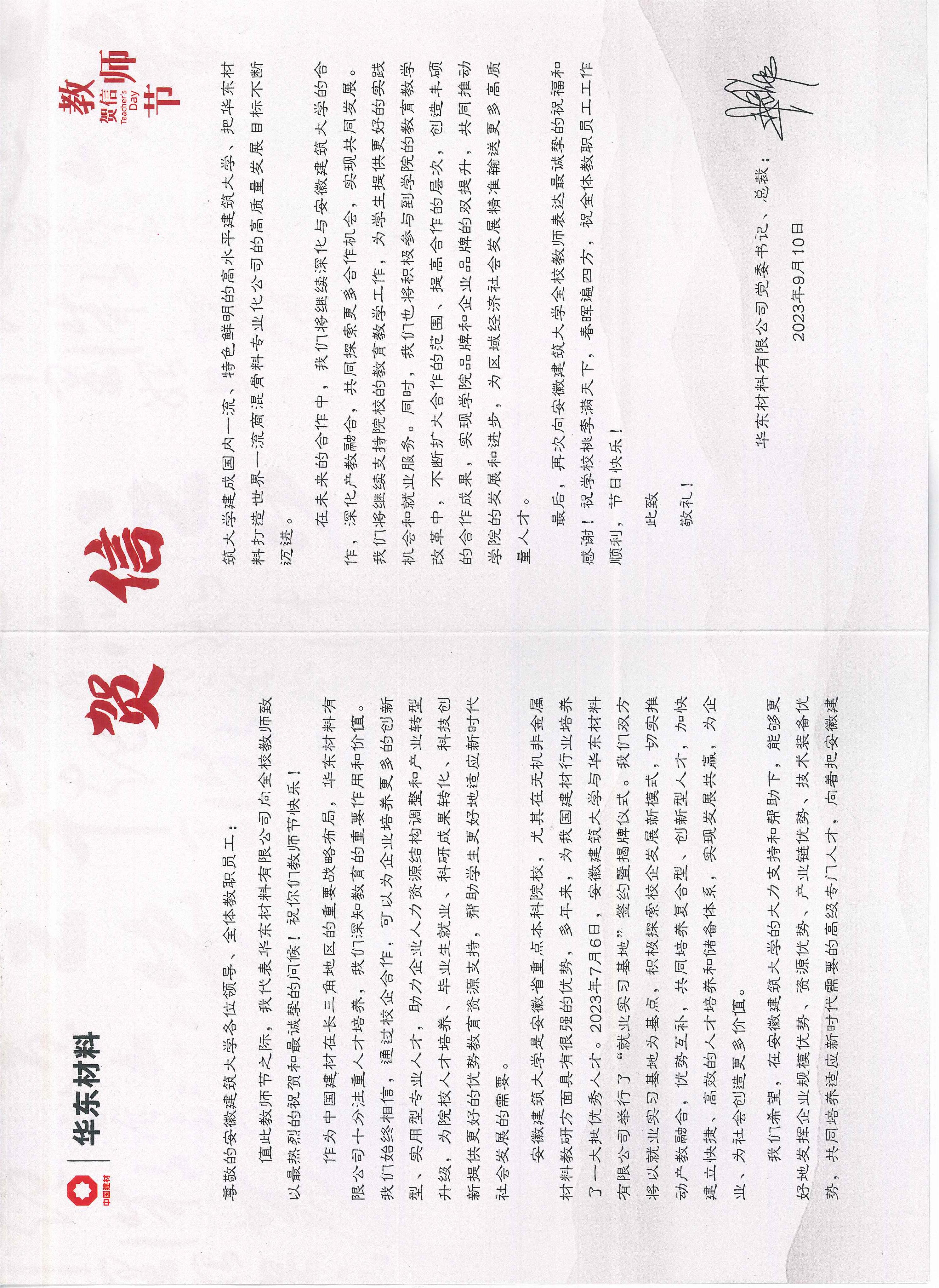 中国建材集团华东材料有限公司教师节贺信
