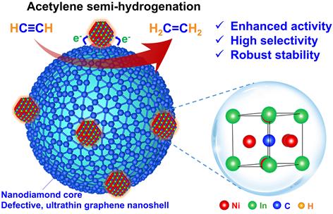 针对传统镍基催化剂选择性低、稳定性差的技术瓶颈,该研究创新性地将反钙钛矿结构Ni3InC0.5与缺陷型纳米金刚石-石墨烯(ND@G)载体相结合,大幅提升了催化剂的整体性能。在实际乙炔半氢化测试中,该催化剂实现了95%的乙炔转化率与85%的乙烯选择性,并可在工业条件下稳定运行超过250小时,超过多数现有催化剂。该研究成果不仅从基础科学层面拓展了反钙钛矿材料在催化领域的应用前景,更重要的是,为开发低成本、高效率的乙烯纯化工艺指明了新的产业化方向。