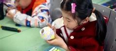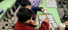 在互动环节,同学们带领小学生们亲手体验陶瓷绘制。孩子们在素坯上自由创作,用画笔勾勒出心中的图案,感受陶瓷绘画的独特魅力。