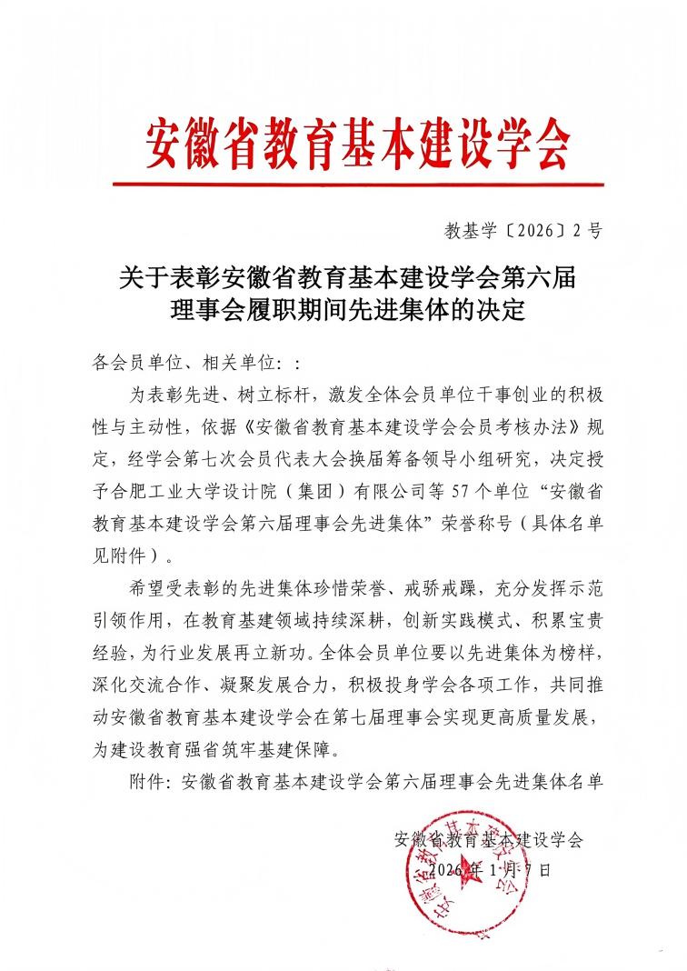 本网讯 近日,在安徽省教育基本建设学会发布的《关于表彰安徽省教育基本建设学会第六届理事会履职期间先进集体的决定》(教基学[2026]2号)中,学校设计研究总院被授予“安徽省教育基本建设学会第六届理事会先进集体”荣誉称号!
