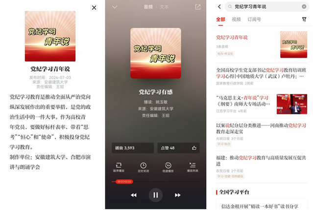 本网讯 近期,由安徽建筑大学建规学院建筑系教师党支部书记许杰青、景观系教师党支部书记姚玉敏、城乡规划专业学生党支部书记王昊禾录制的“党纪学习青年说”专题,在学习强国电台“听文化”频道发布。