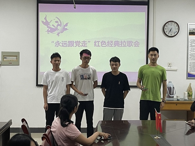 在道桥学生党支部书记张颖演唱的《走进新时代》中“唱支红歌给党听”拉开帷幕。大家传递拉歌,演唱完毕后指定下一演唱人员,下一演唱人员可以选择独唱或者邀请他人合唱的形式。