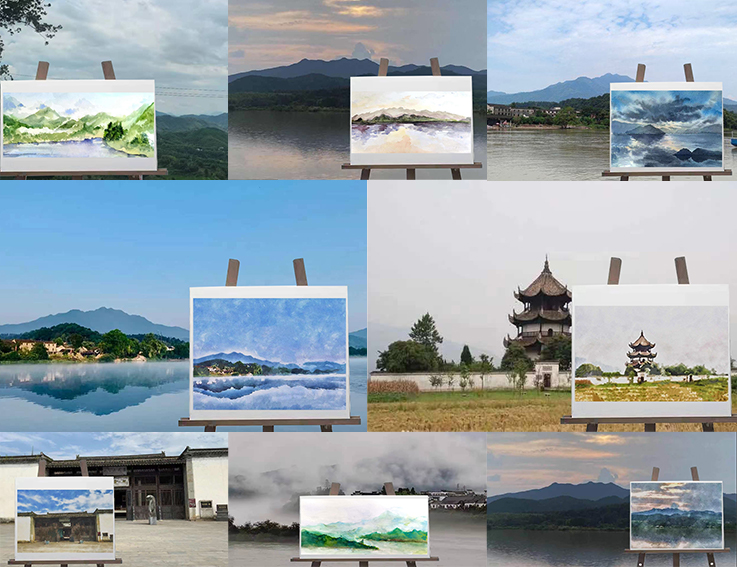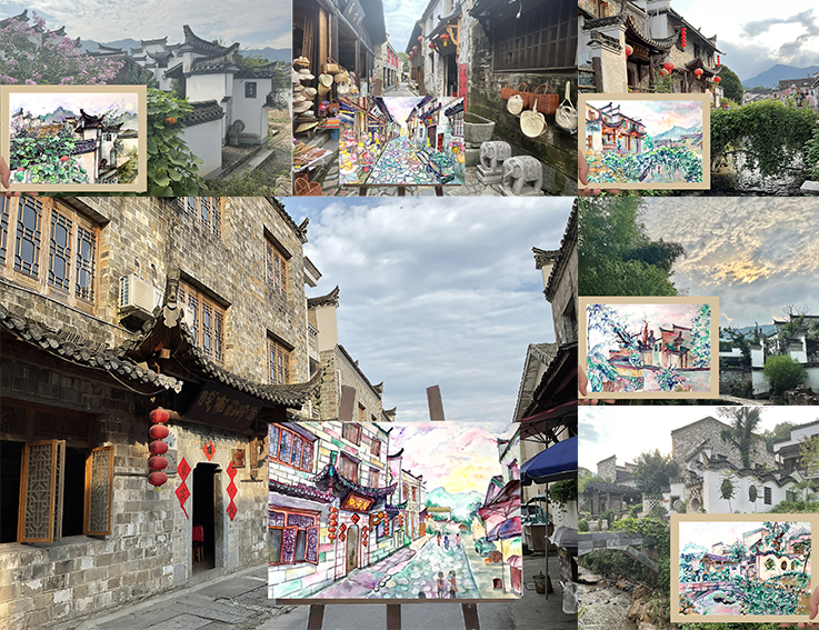 在实践调研的行程过程中,调研团成员充分发挥自身专业特长,用画笔记录下自己在泾县的见闻,将行程所见、所感、所悟以写生绘画的形式进行记录,创作了一系列写生画作,让更多的人们认识泾县、了解泾县。泾县山川秀美,风景如画,碧空如洗,水云接天,这片美好的土地上不仅孕育了美丽的风景,也承载着底蕴深厚的非遗文化,更蕴藏着光辉灿烂的红色精神,历久弥新。