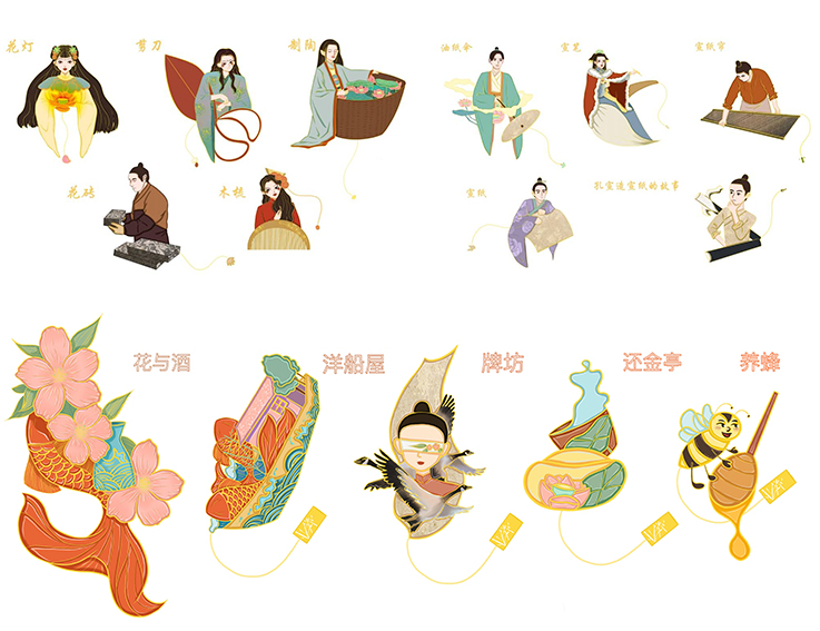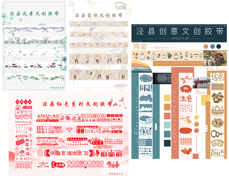围绕“古城青山多烂漫,纸载风土代代传”主题,师生调研团以泾县非遗文化传承作为切入点,走访了宣笔、花砖、宣纸、陶窑等泾县非物质文化遗产原产地,参观了各类非遗产品的制作过程,切身体会了非遗中蕴藏着的民族文化内涵,将学习感悟与自身创作理念相结合,以文创产品为载体,通过胶带、书签、饰品等学习和生活用品形式,用不同的表现形式展现丰富的文化特色,用不同的设计风格体现多彩的理念创意,旨在让泾县的非遗文化以文创产品的形式融入到广大群众的日常生活之中。