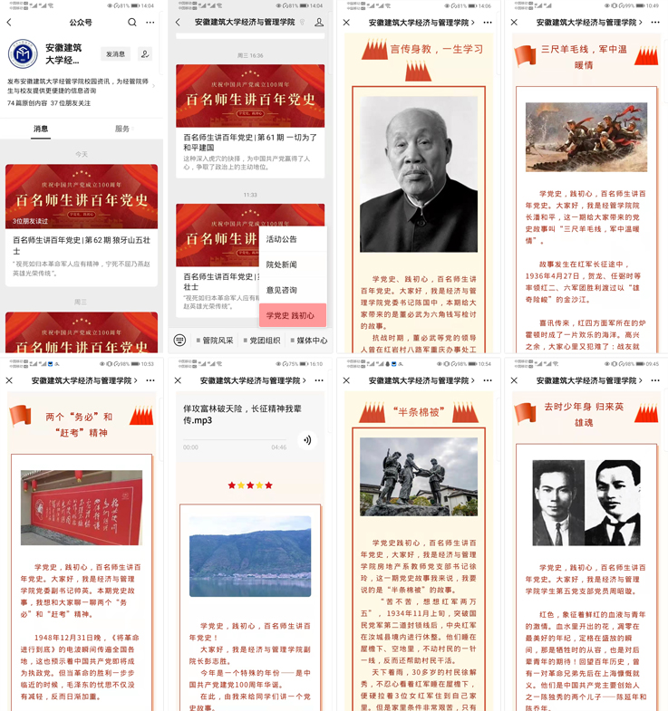 经管学院“百名师生讲百年党史”活动,通过“领导干部带头讲、支部党员跟进讲、青年学子自主讲”的模式,以点带线、以线促面,在全院师生中掀起人人爱学党史,人人争讲党史的热潮。目前,学院微信公众号已经累计发布党史故事60余期,得到广大师生的一致好评,教育成效显著。