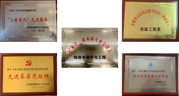 支部建设和专业发展同频共振,发挥党支部政治引领作用,带领和激励党员扎实工作。凝聚专业全体教师智慧和力量,迎难而上,在培养方案修订、博士点申报、实践教学基地建设和学科特区建设等方面,引领、动员教师党员勇挑重担,人尽其才。在全体教师共同努力下,市政工程系在党建工作和专业建设取得了“双丰收”。给排水科学与工程专业2019年12月,获国家级一流本科专业建设点;市政工程系教师党支部先后荣获2018-2020年度学校“三全育人”先进集体、2021年先进基层党组织等称号;市政工程系获2020年安徽省示范基层教学组织、安徽建筑大学本科教学管理先进集体等称号。党支部教师党员王坤、黄健、李卫华分别荣获安徽省“教坛新秀”、校“优秀党务工作者”、“优秀党员”等个人荣誉。