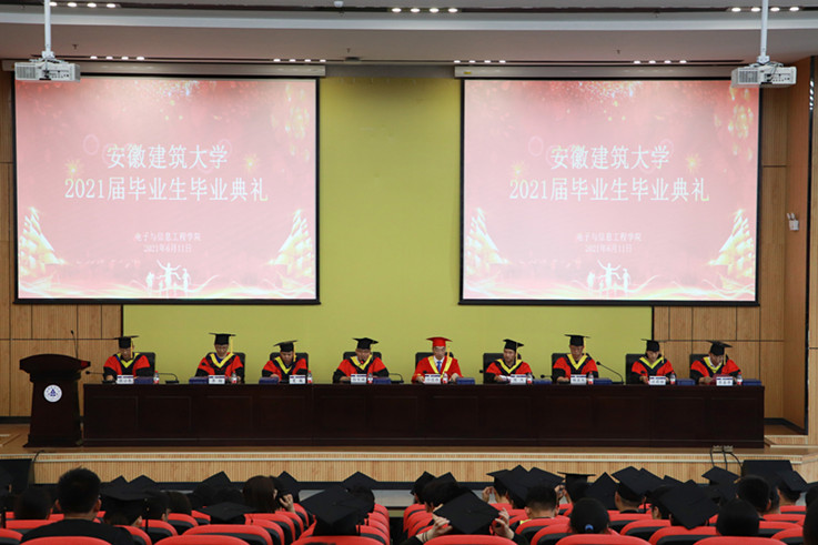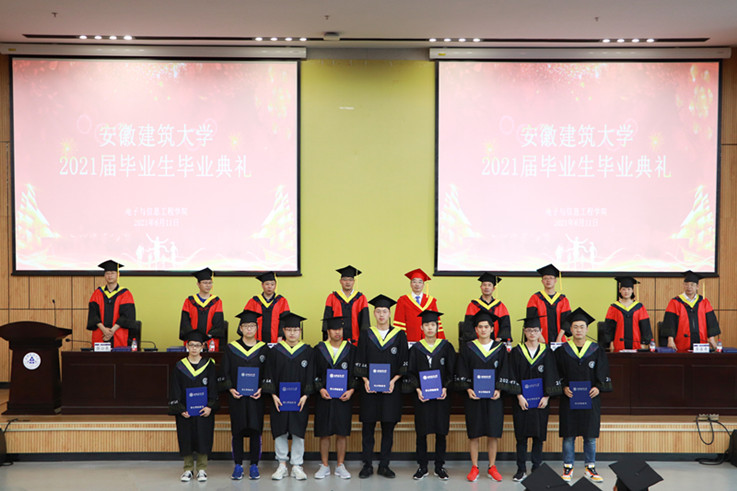 伴随着庄严的国歌声,电信学院副院长杨亚龙向与会全体宣读了省、校级优秀毕业生名单,高文滔等十八位同学获得省级优秀毕业生称号,修赛龙等四十九位同学获安徽建筑大学优秀毕业生称号。全体人员用热烈的掌声表达对受表彰学生的真挚祝贺。孙道胜、学院领导及相关教师代表为所有参会学生颁发学位,拨穗正冠并合影留念,流苏扶正,麦穗成熟,希望毕业生们不忘母校,锐意进取,报效社会。
