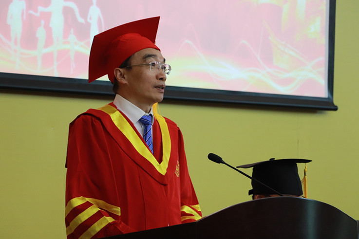 校党委书记、校长孙道胜发表讲话,他代表学校全体教职员工,向圆满完成学业的同学们表示热烈祝贺。他为同学们的成长感到欣慰,为大家即将毕业走向新生活感到期待。未来在后浪手里,百年征程只是序章,未来必将可期,站在历史和未来的交汇点上,新的伟大征程正在同学们的面前展开,作为新时代的青年,当立足百年大党新起点,在我党红色基因的强大精神感召下,坚守初心,砥砺奋斗,争做堪当大任的时代新人。同时,他对毕业生们提出了三点期望:一是砥砺品德,让完善人格成为人生的必修项;二是勤学善思,让终身学习成为一种生活方式;三是敢为人先,让开拓创新成为一种生活常态。祝愿同学们良人相伴挚友相随。在这个祖国强盛与个人命运相互交织的年代,他希望毕业生们能走向波澜壮阔的征程,无论未来怎样,母校将永远在身后默默支持着毕业生们。