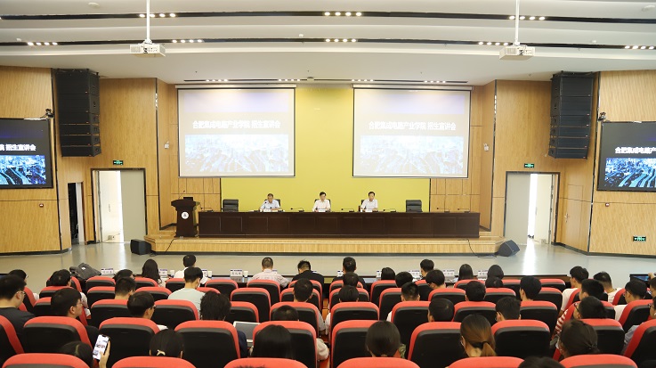 本网讯 7月13日,长鑫存储技术有限公司合肥集成电路产业学院(筹)来校开展专题招生宣传和招聘宣讲。此次宣讲会议采取“线上+线下”方式进行,会议由校党委常委、副校长闵杰主持,校党委书记孙道胜、合肥集成电路产业学院(筹)校长、长鑫存储技术有限公司党委书记王厚亮、电信、机电、材化、数理等学院相关专业近400名学生参加宣讲。
