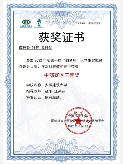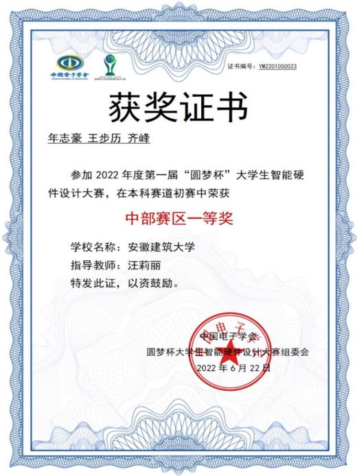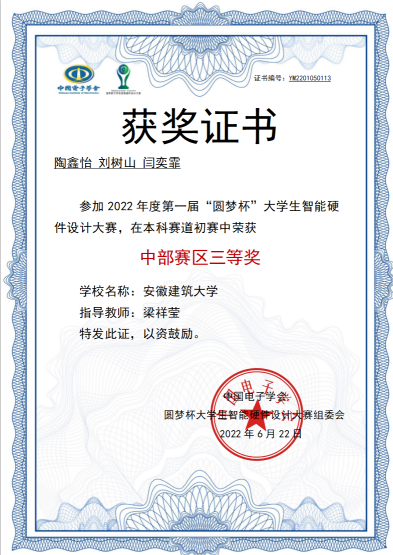 本网讯 第一届“圆梦杯”全国大学生智能硬件设计大赛初赛于6月5号圆满结束。我校电信学院参赛的3支队伍全部获奖,分别斩获中部赛区一等奖1项,三等奖2项。
