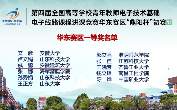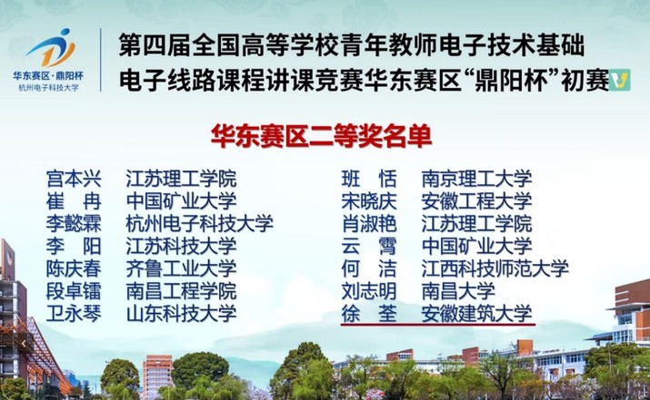 本次比赛由教育部高等学校电工电子基础课程教学指导委员会、中国电子学会电子线路教学与产业专家委员会、全国高等学校电子技术研究会主办,旨在加强电子技术基础、电子线路课程青年教师教学基本功和能力训练,发挥授课竞赛在提高教师队伍素质中的引领示范作用,促进全国高校电子技术基础、电子线路课程的教学质量提高。该赛事已纳入全国普通高校教师教学竞赛状态数据统计,是考核高校教师能力指标体系的一项重要赛事。来自中国矿业大学、杭州电子科技大学、安徽大学、山东大学等20多所高等院校的教师参加了华东赛区比赛。电信学院戚鹏和徐荃两位教师精心准备,反复打磨,提升授课效果,赢得专家评委的普遍认可。