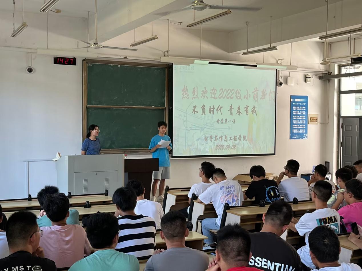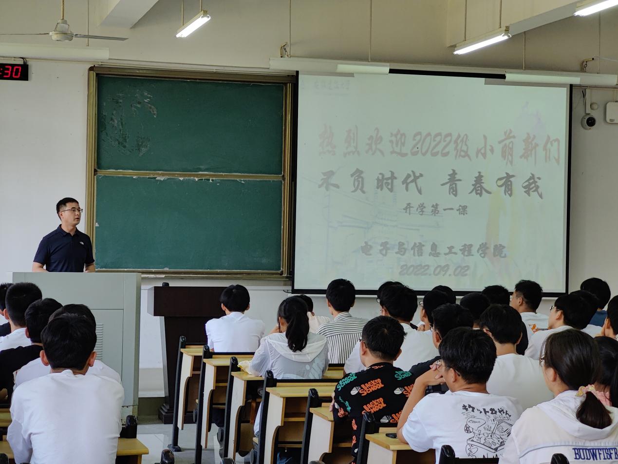 本网讯 9月2日,电子与信息工程学院“不负时代,青春有我”开学第一课主题班会在逸夫楼举行,由此,电信学院2022级新生入学教育系列活动正式拉开帷幕。电信学院各位新生辅导员给2022级新同学们带来了一场别开生面、内容丰富的精彩班会。
