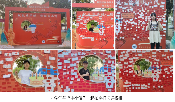 活动中,在学院志愿者的引导下,参与活动的同学们纷纷与学院虚拟形象“电小信”一起拍照打卡送祝福,通过节日贴纸书写个性祝福语,黏贴在象征祖国山河的长城上来为祖国妈妈庆生。
