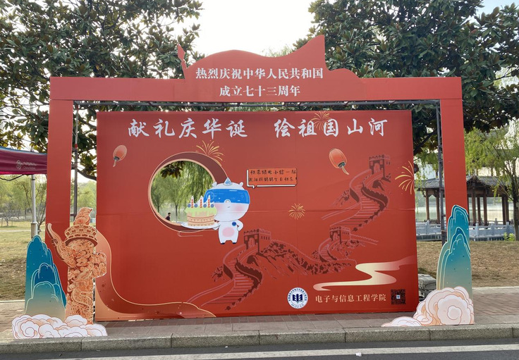 本网讯 为庆祝国庆佳节,增强广大学子的爱国热情,营造积极向上的校园文化氛围,以昂扬奋进之姿迎接党的二十大,在祖国母亲73周岁生日来临之际,电信学院于南校区开展了“献礼庆华诞 绘祖国山河”国庆特别活动。