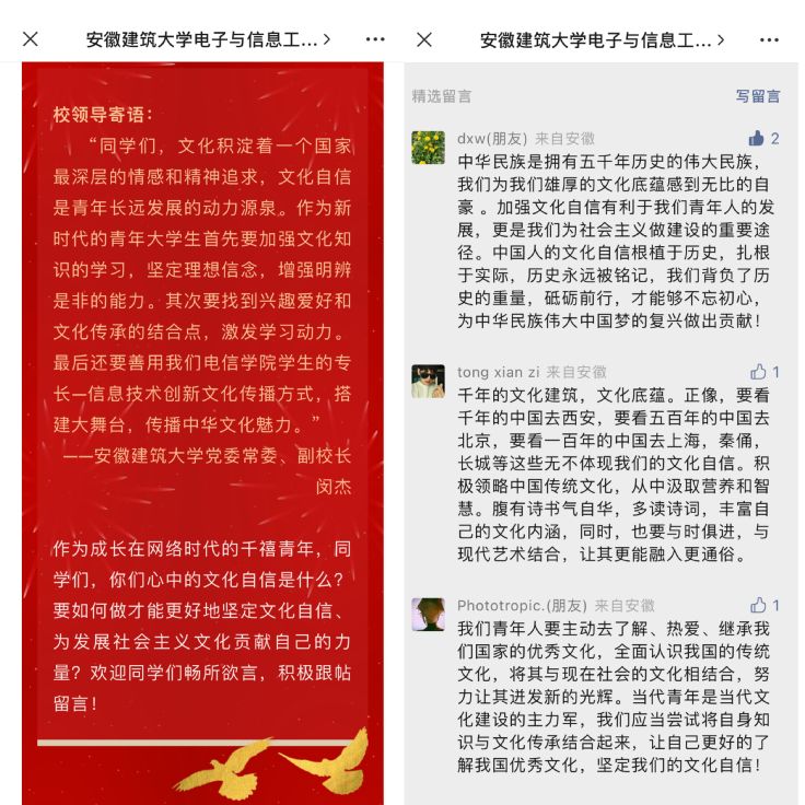 习近平总书记在二十大报告中提到,“要推进文化自信自强,铸就社会主义文化新辉煌。”电信学院在易班、微信公众号上发起以“新时代青年的文化自信”为话题的热烈讨论。