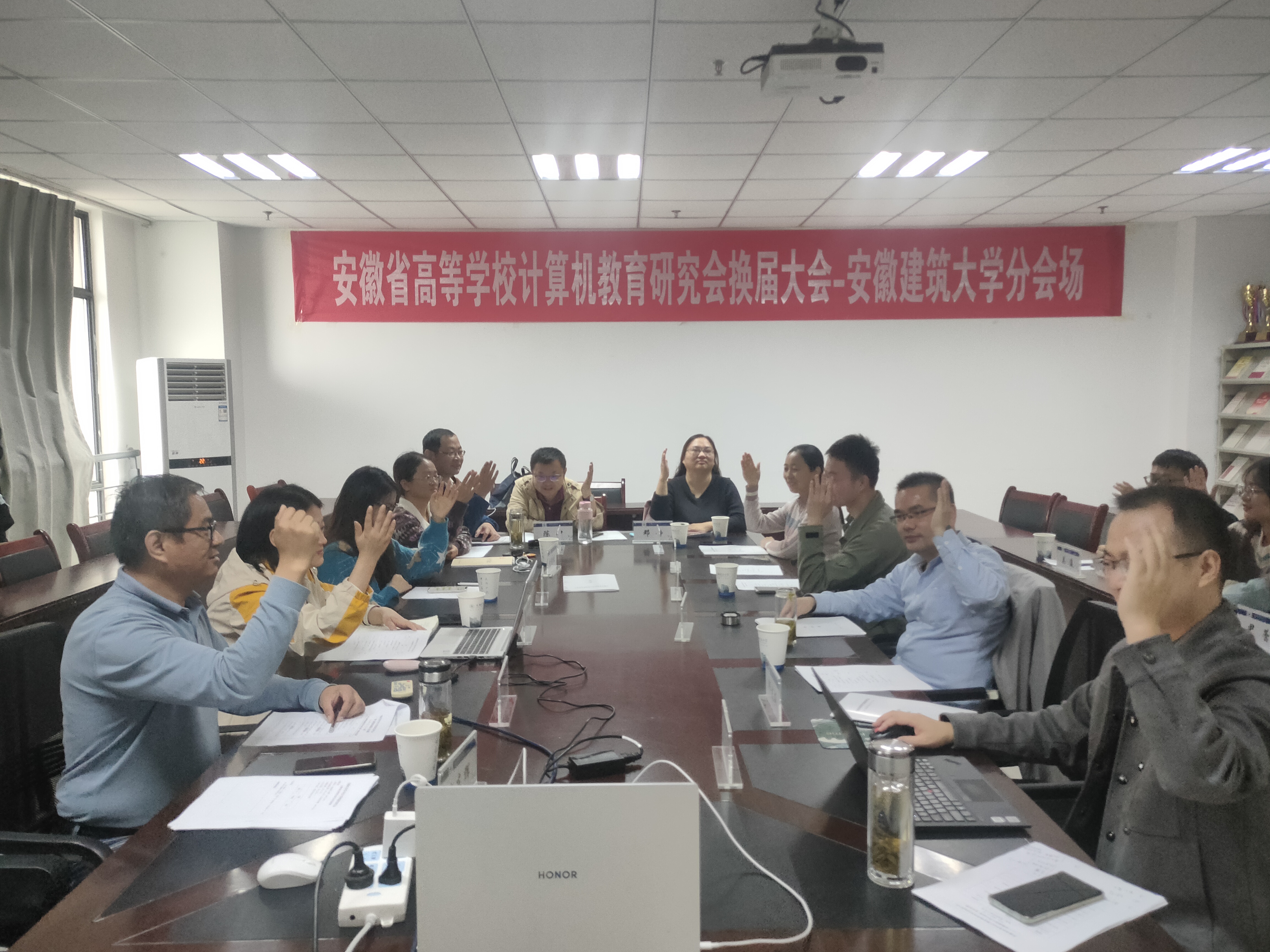 本网讯 2022年11月12日上午,安徽省高等学校计算机教育研究会第三届理事会换届大会顺利召开。受疫情影响,本次换届大会采取线上线下相结合的方式举办,大会主会场安排在合肥,省内各地级市、在肥各理事单位设置分会场。电子与信息工程学院承办了安徽建筑大学分会场会议,副院长汪莉丽组织18名会员教师参加此次会议,会议由计算机系主任苏亮亮主持。