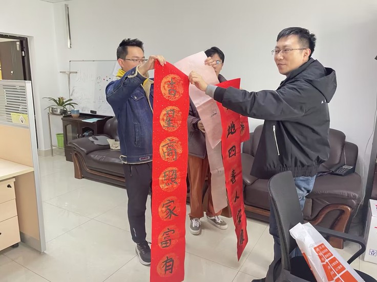 活动现场,电信学院师生们欢聚一堂,或认真欣赏,或仔细琢磨,或亲自上阵,好不热闹。本次活动最终书写春联、福字百余幅,各位同学还将春联送到在校老师手中,表达了对师长的敬意和新春的祝福。