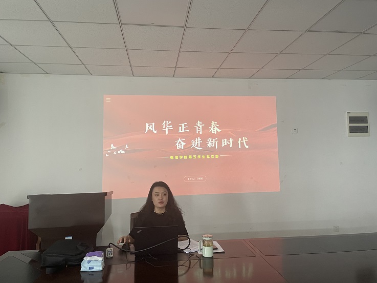学院党委副书记丁媛媛《风华正青春,奋进新时代》为题,为学生第五党支部讲授专题党课,她从“习近平新时代中国特色社会主义思想的丰富内涵”、“党的二十大提出的战略部署和目标任务”、“习近平总书记关于教育的重要论述”以及“固本强基—做好学生的引路人”等四方面,深入浅出地讲授了如何深刻领会全面把握习近平新时代中国特色社会主义思想的科学体系、核心要义及实践要求。她强调要把握主题教育“学思想、强党性、重实践、建新功”总要求,扎实以党的创新理论武装头脑、强化党性、指导实践、推动工作,切实把主题教育成效转为学院振兴发展务实成果。