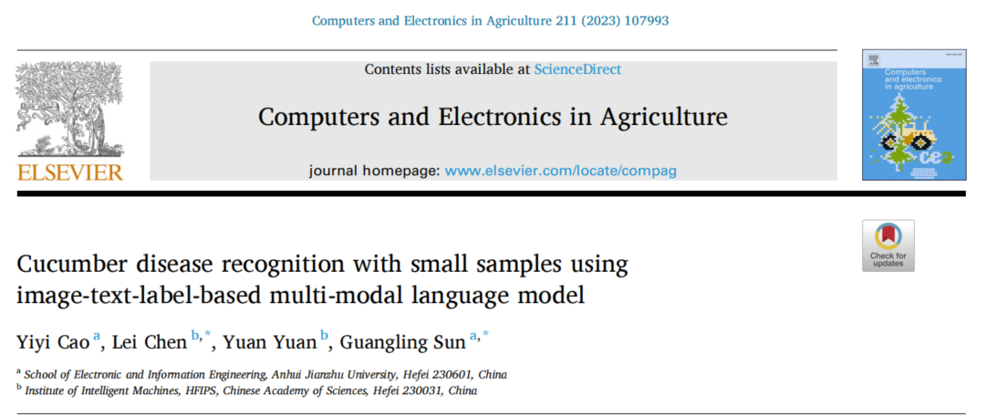 本网讯 近日,电信学院2021级模式识别与智能系统专业研究生曹亿亿在中科院合肥物质科学研究院陈雷副研究员、电信学院孙光灵老师的共同指导下,在国际期刊《Computers and Electronics in Agriculture》(IF=6.757,中科院农业综合1区,农林科学TOP期刊)上发表题为“Cucumber disease recognition with small samples using image-text-label-based multi-modal language model”的研究论文。