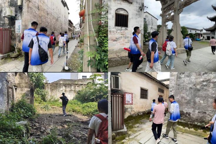 在带队老师的带领下,“徽韵筑梦科创”实践团队的志愿者们先后来到了歙县棠樾村、许村对牌坊群、敦睦堂等徽派古建筑群落,针对古建筑的修复现状与保护情况进行了实地考察与调研。团队成员深入到古村落内部,对牌坊、祠堂等具有徽派建筑特色,彰显古徽州人文气质的文物进行了基础数据的收集,利用航拍和数字化技术对古建筑、古村落进行了整体的拍摄录像和数据采集,对墙体、柱子的裂缝虫蛀等破损及其修复的痕迹进行科学细致地记录,为后续修复提供了技术支持,助力数字化乡村建设和古建筑保护研究。