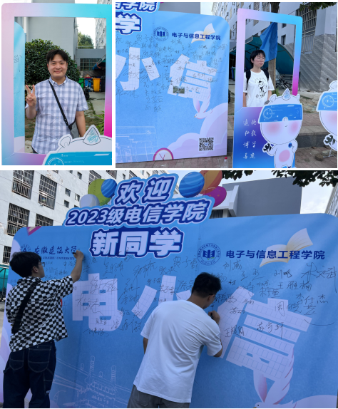 迎新中,听闻学院2023级香港籍新生梁同学一人来校报到,且后续邮寄行李较多,辅导员立即安排了志愿者和新生一起带着小推车去快递站取来了行李并帮忙运到宿舍。“谢谢导员,谢谢大家!”梁同学被学院老师和学长们热情感动了,连声道谢。志愿者们用微笑迎接每一位新生,工作虽然繁琐和忙碌,但他们毫不懈怠,他们动人的微笑是这九月最美丽风景,他们积极引导2023级新生们在学院特色打卡展板前签下自己的名字,并在学院虚拟形象“电小信”展板旁拍照留念,充分展现学院特色文化传承,增强新生对学校学院归属感。