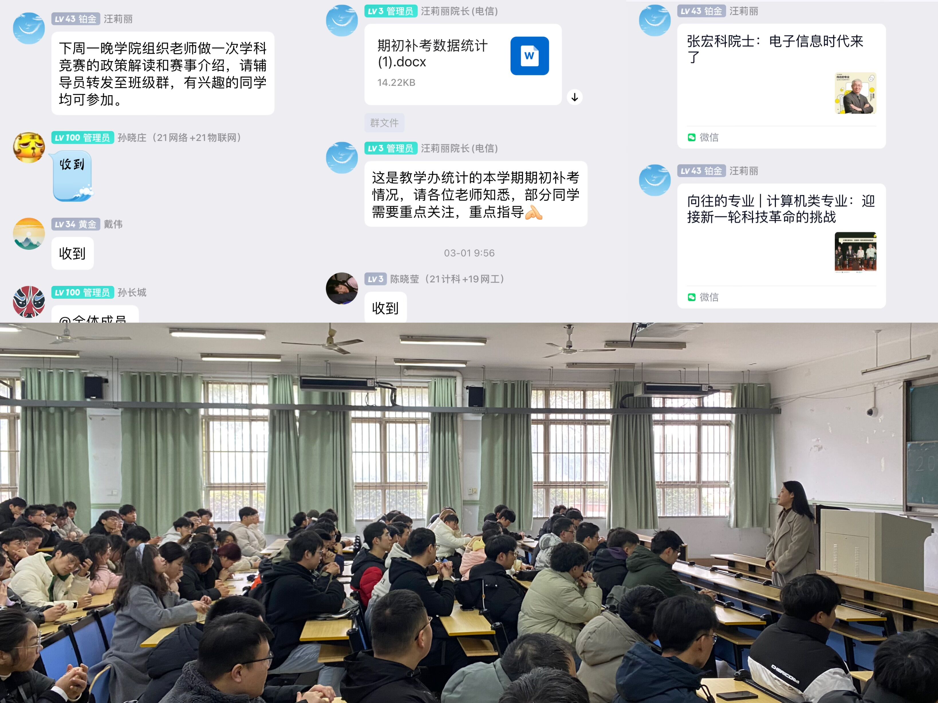 重视分析与调研,心系学生学业发展。学院辅导员通过个别谈话、巡课、巡宿舍、巡晚自习等形式,对部分挂科率较高、学科基础较薄弱、自主学习能力不足的学生开展调研,一生一例,做好持续帮扶,结合前期单独调研情况,分专业召开主题班会,对学生挂科情况、重修情况、学分绩点获得、四六级通过率等方面,进行全面分析,并针对学分互认、免听、通识课修读、高阶英语修读等多数学生较为关心的问题,进行耐心细致的解答。针对2023-2024学年第一学期学生挂科较多的情况,学院领导班子结合实际,认真开展学情分析调研,学院副院长汪莉丽协调教学秘书,发布各年级期初补考数据统计分析,以供学业导师、辅导员和学生自身皆能及时地发现问题、解决问题,加强了学生学习的有效性、针对性,对于营造良好的学习氛围,提升学院人才培养质量和水平也有极大助力。