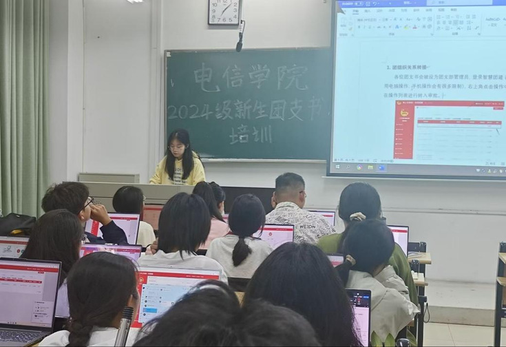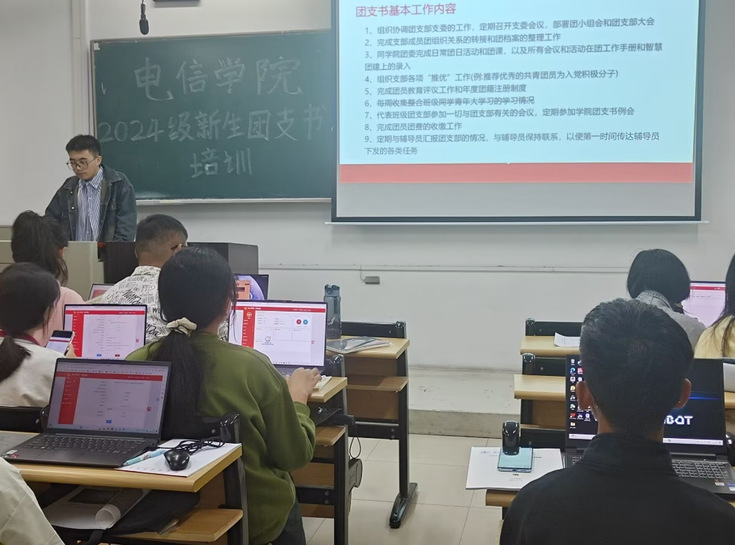 本网讯 为深入学习贯彻习近平新时代中国特色社会主义思想和党的二十届三中全会精神、全国教育大会精神,夯实团支部的组织建设和思想建设,进一步加强团干队伍建设,近日,电信学院团委在主教楼开展专题学习研讨暨新生团干部培训会,学院团委委员、学生会负责人、团员代表和全体新生团支部书记参会。