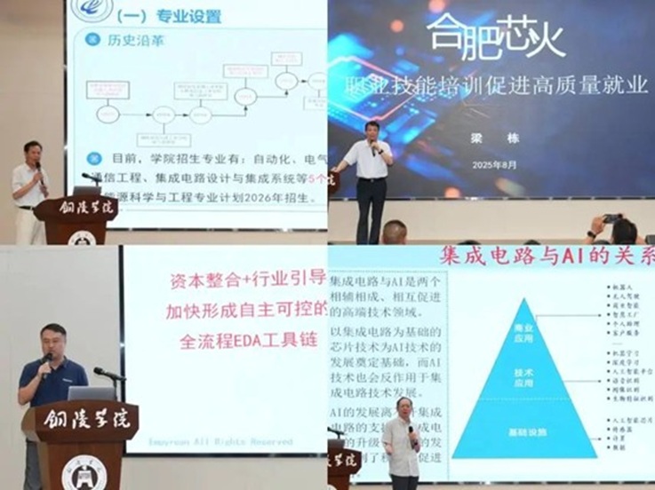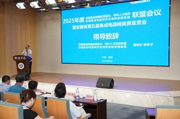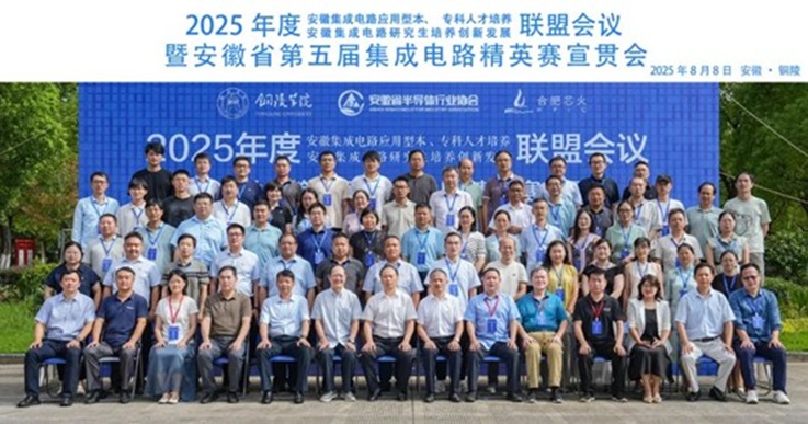 本网讯 8月7日至8日,由安徽集成电路应用型本、专科人才培养联盟、安徽集成电路研究生培养创新发展联盟、合肥国家“芯火”双创平台、安徽省半导体行业协会主办,铜陵学院承办,合肥工业大学、安徽大学、安徽建筑大学、合肥师范学院、安徽省仪器仪表学会、合肥芯火职业技能培训学校有限公司协办的2025年度安徽集成电路应用型本、专科人才培养联盟、安徽集成电路研究生培养创新发展联盟暨安徽省第五届集成电路精英赛宣贯会在铜陵顺利召开。本次大会邀请到省工业和信息化厅电子信息处副处长吕秀峰,铜陵学院校党委副书记、校长苏本跃教授,安徽省集成电路人才培养联盟理事长陈军宁,联盟常务副理事长等出席开幕式。来自省内高校、企业科研机构八十余位代表出席了会议。
