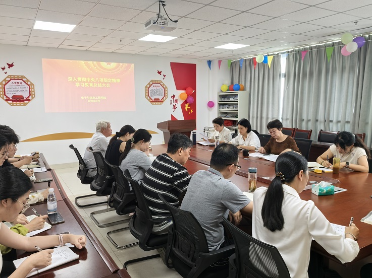 本网讯 9月12日,电信学院召开深入贯彻中央八项规定精神学习教育总结大会。会议紧扣“巩固学习成效、深化作风建设”核心目标,集中传达学习习近平总书记关于深入贯彻中央八项规定精神学习教育的重要指示精神,系统总结学院此次学习教育工作取得的成效,并对下一步巩固拓展学习教育成果、推动作风建设常态化长效化作出具体安排部署。学院党委委员、各党支部书记、党员群众代表及科级干部代表参会,会议由学院党委组织员尹雪莲主持,学院党委书记张润梅作学习教育总结讲话。