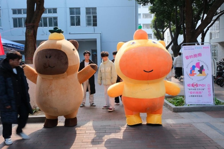 活动现场还特别放置了两个温暖可爱的卡通玩偶欢呼跳跃,引来不少同学驻足拍照。在冬日阳光的照射下,学子们在互动中坦诚交流,在体验中释放心绪,于指尖的创造与心灵的共鸣中,卸下压力,重拾轻盈。不少同学感慨,这场心理嘉年华打破了传统心理活动的刻板印象,以诗意的形式贴近心灵需求,无论是手作香囊时的专注沉淀,还是梳理情绪时的自我观照,都让自己收获了直抵内心的治愈,体悟到成长的力量。