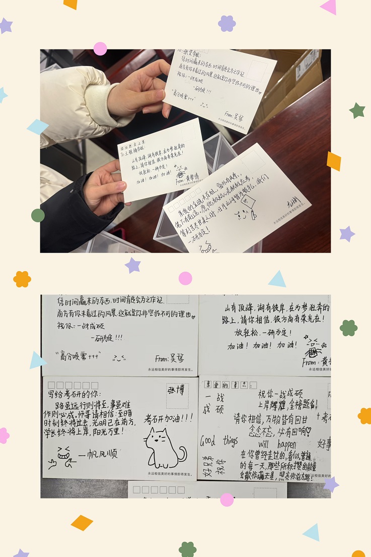本网讯 为帮助考研学子缓解备考压力、提振冲刺信心,近日,安徽建筑大学电子与信息工程学院学生第一党支部举办“研途送温暖”主题党日活动。支部学弟学妹们以手写明信片、赠送考研大礼包的方式,传递真挚关怀与祝福,让考研路上的温暖与传承同行。