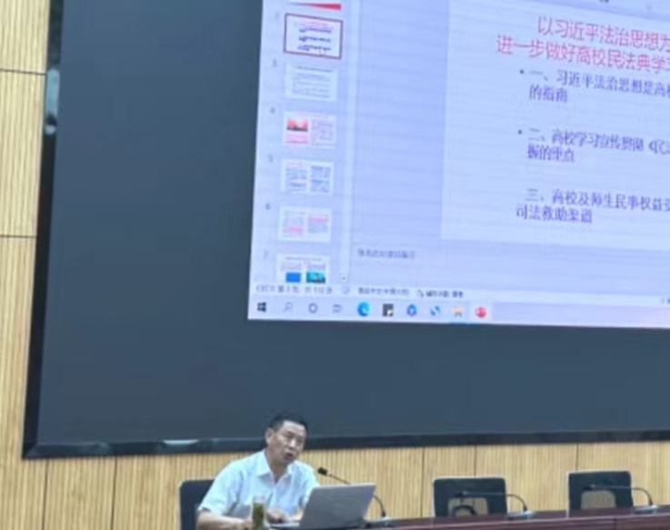 俞秀国阐述了习近平法治思想,从新时代为什么实行全面依法治国和怎样依法治国的重大问题入手,结合《中国共产党章程》、《党支部工作条例》、《教育法》、《教师法》中关于党员干部遵守国家法律的要求,结合正在开展的党纪学习教育,就高校师生学习《民法典》应把握的内容进行了重点解读,配合大量的现实案例深入浅出讲解了如何将《民法典》精神落实到高校日常管理及教育教学中。其中,结合物权篇解读了保护国有资产安全,合同篇解读了精准签订合同,人格权解读了维护师生合法权益,侵权责任解读了维护校园安全和师生身心健康。