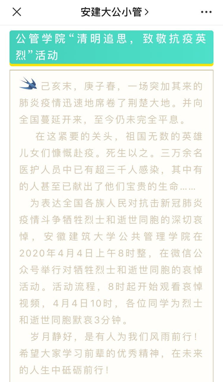 本网讯 国旗半垂,举国同悲。4月4日,庚子年清明节,公管学院举行线上哀悼活动,一起深切悼念抗击新冠肺炎疫情斗争牺牲烈士和逝世同胞。公管学院全体学生参与此次活动。