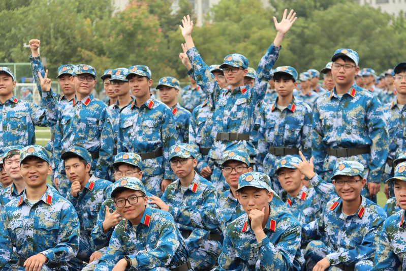当娇艳的晨曦温暖地抚摸大地,那一抹抹动人的建大蓝从宿舍楼里涌出,汇聚成训练场上的汪洋大海。清晨的微风拂过同学们挺拔的军姿,年轻的面孔不惧骄阳。