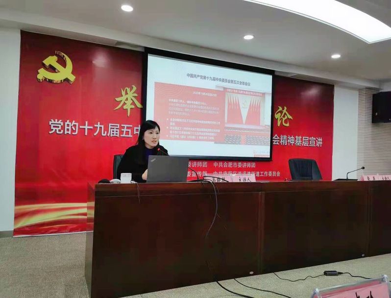 本网讯 近日,按照省委统一部署,“举旗帜,送理论”党的十九届五中全会精神暨省委十届十二次全会精神宣讲在全省展开,省委专家宣讲团成员,安徽建筑大学公共管理学院党委副书记马晓艳走进庐阳区,向四牌楼商圈企业代表作十九届五中全会精神专题报告。