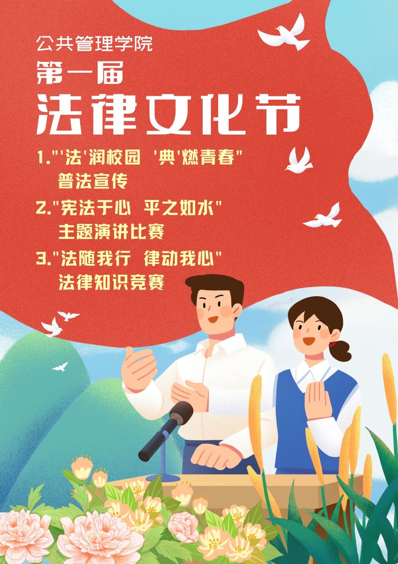 本网讯 铸法治之基,行法治之力。为深入学习贯彻习近平法治思想,贯彻落实习近平总书记关于加强宪法法治宣传教育的重要指示精神,深入开展法治宣传教育,提高全民法律素质,培育法治文化,在第八个国家宪法日来临之际,公共管理学院学宪法讲宪法系列活动暨第一届法律文化节顺利开幕。本次系列活动分专题报告、普法宣传、演讲比赛和知识竞赛四个部分,旨在引导全院师生尊崇宪法、学习宪法、遵守宪法、维护宪法,自觉成为宪法的忠实崇尚者、自觉遵守者和坚定捍卫者。