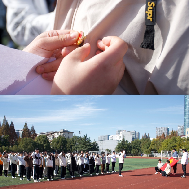 一名团员就是一面旗帜,一枚团徽就是一份担当。为培养青年学生的责任意识,激励广大建大学子牢记“进德弘毅博学善建”的校训,学院组织新发展团员在北区操场隆重举行入团宣誓。“我志愿加入中国共产主义青年团,坚决拥护中国共产党的领导……”,在领誓人的带领下,团员们共同举起右手,面向团旗庄严宣誓,铿锵有力的宣誓声极大地调动了学生们的热情,唤醒了团员的身份意识,也增强了新发展团员的责任感、使命感和归属感。团员身份既是荣誉,也是责任,更是使命。