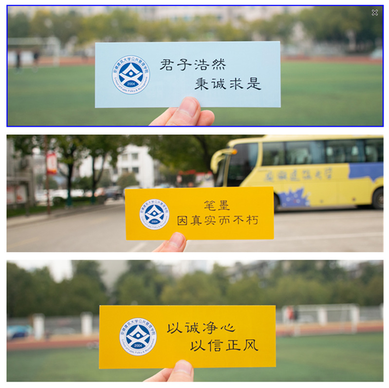 诚信文创书签一套共5张,皆由学生自主设计,每张书签图案精美,意义深刻,一面写上诚信格言,如“以诚净心,以信正风”、“君子浩然,秉诚求是”、“笔墨,因真实而不朽”等;另一面则印着以易海亭、九月桥、北区公管楼和北区教学楼为选景的图片,希望通过这种新颖的方式,让同学们在诚信格言、美丽校园中领略诚信之美、诚信之道。