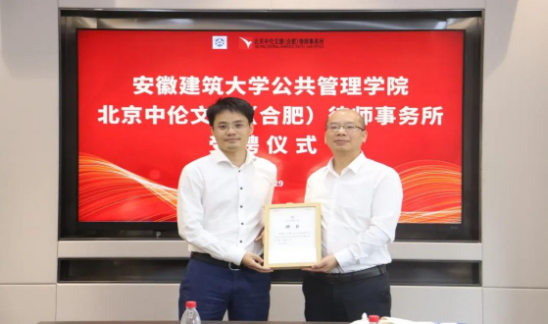 随后,双方共同为“安徽建筑大学公共管理学院实践就业基地”揭牌。并聘任江亮律师为安徽建筑大学公共管理学术型硕士研究生兼职实务导师,徐成军律师、戴正有律师被聘为兼职教授,高立品律师、张立超律师为法学本科专业兼职实务导师。