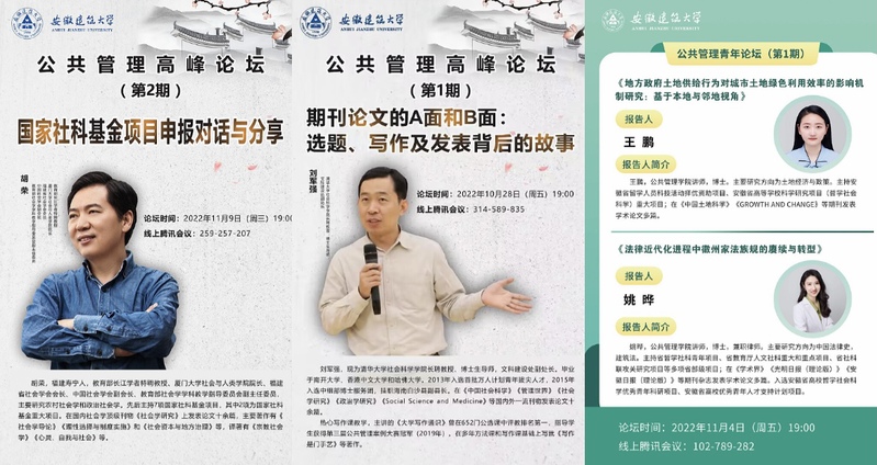 “公共管理高峰论坛”旨在通过邀请一流大学的一流学者做一流报告,提升国家基金申报质量;“公共管理前沿论坛”邀请省内外的期刊主编、公共管理学科领域的知名专家开展讲座,增强科研的创新效率;“公共管理青年论坛”邀请校内外青年学者进行科研分享,营造良好的青年学者交流环境。