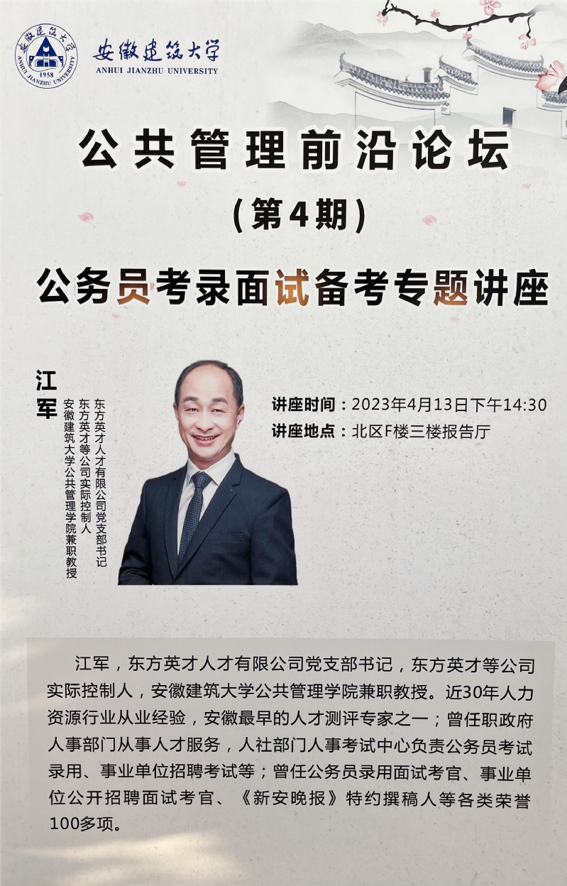 本网讯 为进一步提升公管学子在公务员考试中的应试能力,助力毕业生更高质量就业,4月13日,公管学院在F楼三楼报告厅举办公务员考录面试备考专题讲座,讲座由东方英才人才有限公司党支部书记江军主讲,学院院长黄佳豪主持,辅导员代表、2019级考公进面同学、2020级志愿考公同学参加。