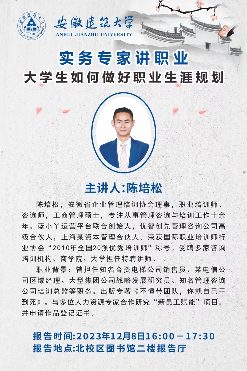 本网讯 筑梦青春志在四方,规划启航职引未来。为全面普及大学生职业生涯规划知识,增强大学生专业认知与学习自觉,12月8日,公管学院邀请安徽省企业管理培训协会理事陈培松老师,在北区图书馆二楼报告厅开展“大学生职业生涯规划”主题报告,学院相关专业同学积极参加,学院副院长连瑞瑞主持活动。