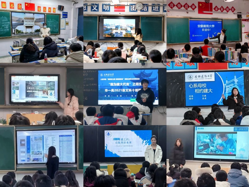 他们在庐江中学、芜湖一中、淮南二中、滁州中学、淮北一中、蚌埠二中等省内名校,衡水枣强中学、杭州第三高级中学、商丘市第一高级中学、平顶山四中和浮山中学等省外高中,广泛宣传建大的严谨治学和多彩生活,向高中生广撒憧憬象牙塔的星火。