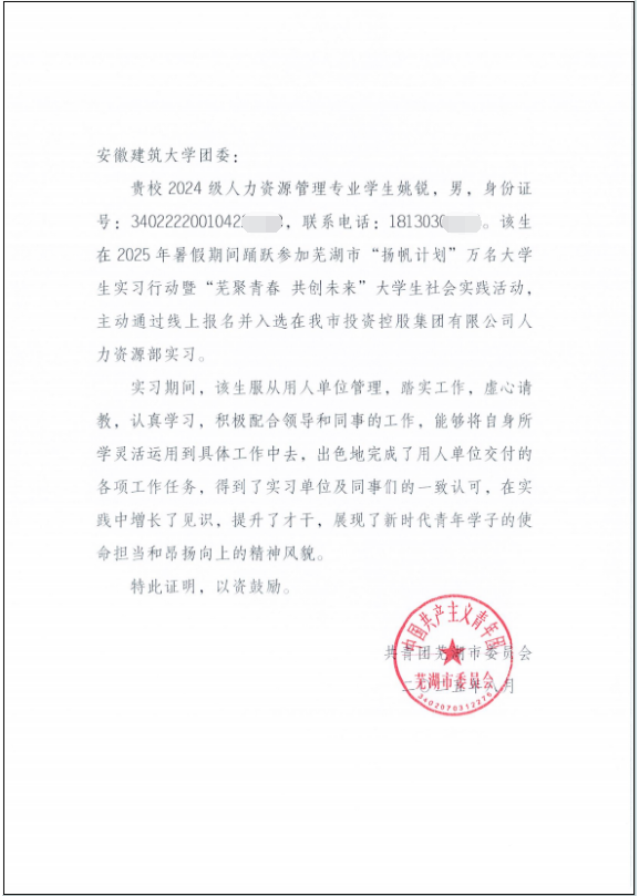 本网讯 近日,校团委收到共青团芜湖市委员会发来的表扬信,对公管学院 2024 级人力资源管理专业学生姚锐在“扬帆计划”实习实践活动中的出色表现给予高度认可与赞扬。