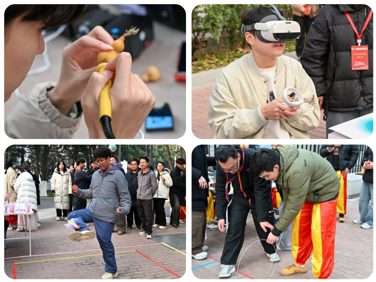 “趣玩冬俗 乐享非遗”作为“趣·冬”文化艺术节的启幕单元,以“科技赋能+指尖实践+活力竞技+温情滋养”多元形式,浸润无声地推动文化育人目标落地见效。VR科普阅读区以前沿技术营造沉浸式学习场景,帮助学生在时空穿梭中拓宽认知视野;非遗糖画、非遗竹编、葫芦烙画等9项劳动体验项目,紧扣“五育并举”目标,让学生在劳动创作中体悟匠心,筑牢文化自信;踢毽子、滚铁环、投壶等传统体育项目,唤醒青春动能,于协作竞技中磨砺坚毅品格;三河米饺、蒿子粑粑、糖葫芦等传统特色美食传递人文关怀,让校园文化更显温度;京剧、舞蹈、合唱等快闪表演,让学生在艺术浸润中厚植家国情怀。