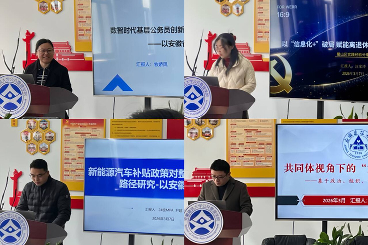 在汇报分享环节,牧娇凤以《数智时代基层公务员创新行为现状及优化路径研究——以安徽省T市为例》为题,聚焦基层治理现代化背景下的公务员队伍建设,分析了数智技术对公务员创新行为的影响机制,并提出相应的优化路径。汪家玲以《以“信息化+”破局赋能离退休干部党建高质量发展——蜀山区实践经验分享》为题,探讨信息化手段在党建和智慧养老中的应用成效,展现党建工作与数字技术融合的新路径。尹超以《新能源汽车补贴政策对整车企业的发展路径研究——以安徽省为例》为题,系统评估了补贴政策对新能源汽车产业发展的推动作用,并结合安徽实际,提出促进产业升级与绿色发展的政策建议。凤炜以《共同体视角下的“六尺巷工作法”——基于政治、组织、价值“三个认同”维度分析》为题,将中华优秀传统文化与现代社区治理相结合,从共同体构建的视角深入阐释“六尺巷工作法”的治理逻辑与实践价值。郑跃宇以《影子银行与交叉金融监管政策效果评估研究——以H市商业银行为例》为题,对金融监管政策的实施效果进行实证分析,提出了防范金融风险、优化监管机制的对策建议。韩新月以《以工代赈——一项“以务工代替赈济”的民生工程》为题,深入解读以工代赈政策在促进就业、保障民生、推动乡村振兴方面的实践成效,展现了社会保障政策的现实温度。江玲以《“亩均论英雄”改革驱动产业集聚的路径与机制研究——以安徽省怀宁县为例》为题,分析土地要素改革对产业集聚和高质量发展的驱动作用,为地方政府优化资源配置提供理论支持。陈曙光以《金寨县健全高标准农田建设验收管护机制改革试验的报告》为题,探讨高标准农田建设后期管护机制的完善路径,为农业农村基础设施长效运行提供经验借鉴。