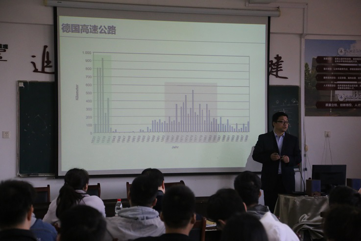 王大为教授在土木学院三楼会议室做了以“德国智能地毯式铺装路面”为主题的学术报告,报告会由土木工程学院院长吴德义主持,道桥系多位专业任职教师与研究生、本科生听取了报告。王大为教授立足国际角度,为我校师生介绍了德国智能地毯式铺装路面的发展。地毯式铺装是柔性可卷曲的预制道路面层,能显著提高抗滑性质和路面排水能力、降噪、降解尾气、能量采集和存储等。地毯式铺装还可作为智能路面的一个载体,实现了交通数据的采集,进而为未来人-车-路的交互、交通流的控制和疏导奠定基础。