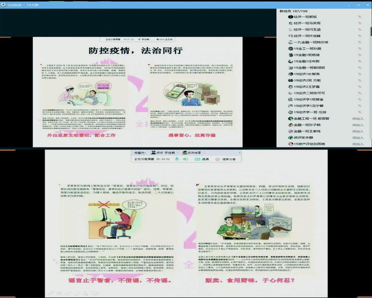 辅导员老师向同学们展示了贩卖假口罩、偷食野味和伪报瞒报等违法犯罪行为,疫情防控正值不断向好态势,将防控与法治相结合,不断夯实防控疫情胜算的基石,这就需要每位同学遵守国家及地方的相关规章制度,在生活中积极配合当地工作人员的安排,遇到危害国家安全的违法犯罪行为及时向相关单位或拨打“12339”举报。